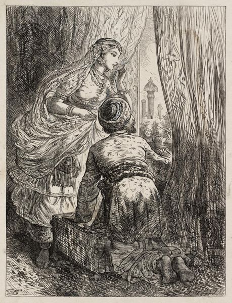 Curator: What strikes you first about this image? It is called Rhea Silvia. Editor: The starkness, I suppose. High contrast ink work; everything reduced to lines and stark black and white. The soldier with his ludicrous helmet somehow heightens the overall sense of the absurd, like a fever dream plucked from history. Curator: The piece presents a rendition of Rhea Silvia, drawn by John Leech. It comes to us as an ink drawing, part of a larger body of narrative-driven illustrations the artist produced. Editor: It's more than just an illustration; it's a social commentary wrapped in classical garb. Look at the details—the woman’s somber, almost defeated posture, versus the soldier's over-the-top regalia. The play between these two figures is striking, almost theatrical. What do you make of it from a compositional point? Curator: Certainly. The composition pivots around binary relationships; a complex play between light and shadow and carefully calibrated linework to emphasize form and depth. Leech's skillful deployment of hatching creates intricate texture across the planes, imbuing the figures and natural features with unique spatial presence. I’d further assert that the structural framework within, although initially discreet, conveys emotional undercurrents intrinsic to the tragic scene. Editor: True, and one can't ignore the sociopolitical backdrop. It plays to popular views of history, maybe with a cynical tone, but I suspect that there were deeper critiques about authority and victimization baked in. Curator: These visual components aren’t just there by accident; each stroke is chosen to invoke the thematic concerns of a story that touches on authority, divinity, and tragedy, even though the specifics of date, place, remain contextual suppositions. Editor: So, while we may not know exactly when or why this was created, we are compelled to question established orders of power and the consequences of injustice throughout the epochs. Curator: A fitting end note. A compelling fusion of form and societal implications allows it to resonate through various epochs and social frameworks. Editor: An excellent point. Leaving us to wonder if art such as this even has an ending at all.