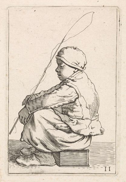 W. Barthautz created this watercolor titled "Zittende vrouw met een juk op haar schouders" or "Seated woman with a yoke on her shoulders". It speaks volumes about the social realities of its time. The image of a woman bearing a yoke offers a glimpse into the working lives of women. This likely comes from the 18th or early 19th century, a period defined by stark class divisions and gendered labor. The yoke itself, a tool for carrying heavy loads, symbolizes the burdens placed upon women. The woman's posture and clothing, particularly her head covering, speak to the social constraints and expectations placed upon women. Was this image made for didactic purposes? Perhaps it was a study of lower class fashion and culture. Understanding this image requires looking into the social and economic history of the time. Research into regional labor practices, gender roles, and the artist's background may shed light on the painting’s meanings and intentions.