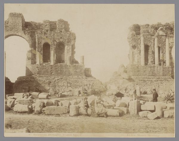 Curator: Giorgio Sommer's "Gezicht op het Griekse theater van Taormina, Sicilië," created sometime between 1857 and 1914, offers a poignant perspective on history, quite literally. It's a photograph of a hand-printed image, seemingly captured on toned paper. Editor: The overwhelming impression is one of melancholy. The muted colors lend a somber air. The decaying architecture suggests a world in decline, doesn't it? I find myself thinking about Romanticism and its fascination with ruins. Curator: Absolutely. The romanticization of ruins ties directly to the burgeoning sense of nationalism sweeping through Europe at that time. These images, circulated widely, invoked a sense of shared heritage and a yearning for a glorious past that could inform the present—often idealizing that past in problematic ways, of course, overlooking social hierarchies. Editor: The composition draws the eye directly to the heart of the amphitheater. Notice how the lines of the remaining structures subtly guide your gaze. Sommer is intentionally creating depth through tonal contrast. Curator: Precisely. Sommer was not only recording a visual scene; he was actively constructing a narrative, participating in the creation of collective memory. We need to remember that this wasn't just about aesthetic appreciation, but also about how the photograph could be deployed within imperial and colonial frameworks to enforce power relations and assert a Western gaze. Editor: Even the type of paper adds to its depth, and this piece certainly looks like aged paper. There is almost a ghostly haze that veils the image and adds to its sense of bygone eras. It feels simultaneously immediate and distant, doesn’t it? A semiotic interplay between signifier and signified, the ruins functioning as signs loaded with historical baggage. Curator: Exactly. The ruins symbolize both cultural achievement and also the transient nature of power. By carefully constructing the visual rhetoric of decline, these photographs helped frame discourses about civilization and its fate, frequently with disturbing implications for contemporary society and ongoing colonialism. Editor: Looking at the photo in this way reveals the image as a site of multiple overlapping discourses, challenging the viewer to unpack its complexities, revealing so much beyond an objective recording. Curator: And precisely why engaging with images such as this can foster important, albeit challenging, dialogue about identity, representation, and the lasting impact of historical power structures on art.