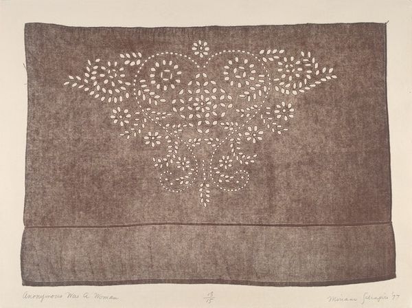 Curator: What immediately strikes me is the delicate, almost ghostly quality of this image. Editor: We are looking at "Anonymous was a Woman II," a 1977 etching and textile work by Miriam Schapiro. She was a central figure in the Pattern and Decoration movement, which aimed to reclaim and celebrate traditionally "feminine" crafts. Curator: So, the choice of lace as the central image feels loaded. The act of making lace itself involved so much handwork and care from often nameless creators. It also was a common item, a status signifier, available to a wide consumer public. Editor: Precisely. Schapiro uses it to question the traditional hierarchy that elevates painting and sculpture above crafts typically associated with women’s work. Where were these women recognized? Who knew the countless hours behind items such as this one? She really addresses that historical blind spot in a profound way, naming "Anonymous was a Woman". Curator: It really invites you to reconsider the materials and labor involved in making decorative objects that have been historically dismissed as merely domestic or frivolous. This isn’t simply lace; it’s an imprint of lives lived and skills mastered. Look closely; it could be your mother’s or grandmother’s handywork. Editor: Right. Think about the institutional history here as well. Museums have traditionally valued artworks considered “fine art” over textile art, and Schapiro's work challenges that very notion, especially given its deliberate use of etching, commonly a fine art medium, to depict what some may categorize simply as decoration. Curator: The texture she achieves with etching is crucial too. By employing printmaking techniques with images of textiles she gives these domestic, and previously devalued works, a fine art stature. Schapiro allows a wide range of audiences to enjoy an ethereal, yet accessible craft, usually confined within the borders of households and private consumption. Editor: Schapiro offers a poignant comment on artistic recognition, gender, and the politics of visibility within cultural institutions, past and present. It demands we acknowledge those whose labor has been historically unseen and uncelebrated. Curator: Considering its time, I see "Anonymous was a Woman II" as a profound reclamation of domestic spaces and artistic validation. It certainly encouraged a broader definition of “art.” Editor: Absolutely, and in doing so, it invited—and continues to invite—viewers to question those established definitions.