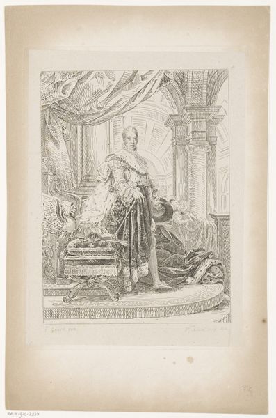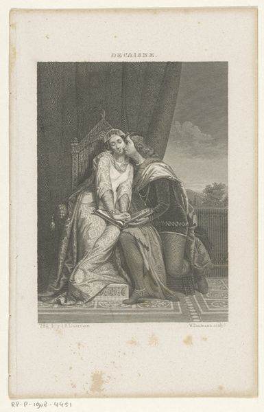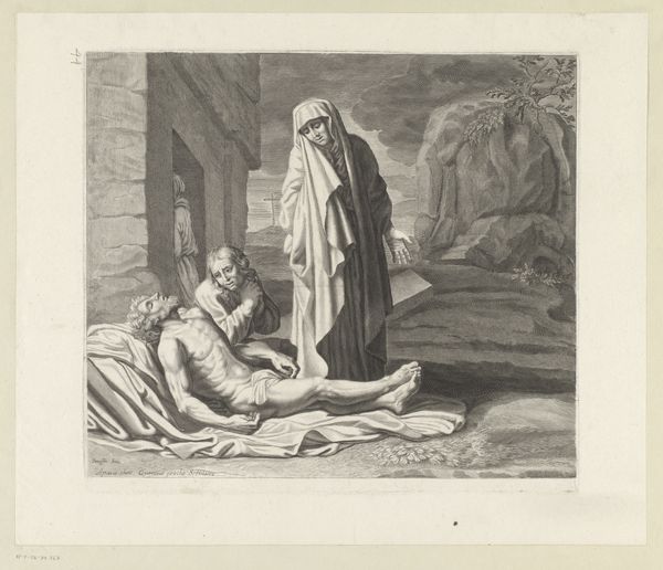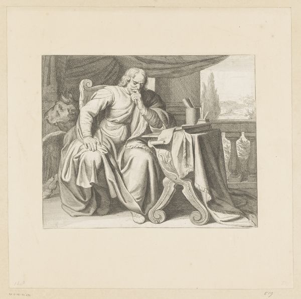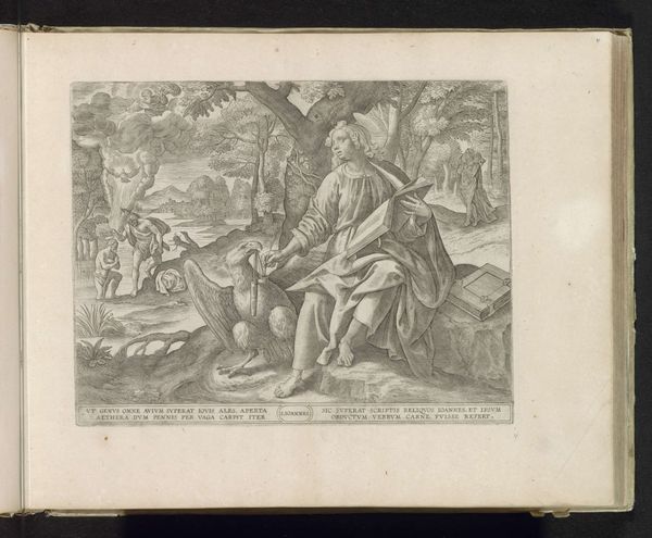 This is "H. Marcus met de leeuw" by Monogrammist VA, an engraving with a composition that balances depth and detail within a limited space. The textures in this print are meticulously rendered, from the soft drapery of Marcus's robes to the lion’s coarse mane, creating a tactile quality that invites close inspection. The image is structured around a vertical axis formed by the seated figure of Marcus, the architectural column, and the distant cityscape. This verticality is countered by the horizontal repose of the lion, creating a visual tension that animates the scene. The artist uses light and shadow to define the forms and create a sense of depth. The interplay of lines, from the fine hatching that models the figures to the bolder strokes defining the architecture, adds to the overall complexity and visual richness. The artist destabilizes the traditional representation of religious icons by emphasizing the physicality of Marcus and the lion, challenging fixed meanings. Ultimately, the fine lines and detailed textures in this engraving function aesthetically and as part of a larger cultural narrative, inviting interpretation.