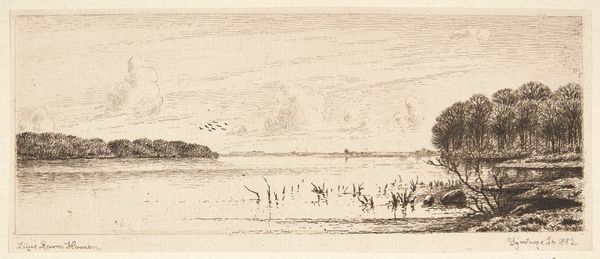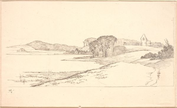 Editor: This is "Kystlandskab," a landscape from 1919 by Poul S. Christiansen. It appears to be done in pencil and ink. There's a kind of melancholy about it, maybe because of the muted tones and sparse composition. How do you interpret this work? Curator: It evokes a feeling of transient memory. Notice how the landscape isn’t rendered with photographic realism; instead, it presents more like a fleeting impression. The lines are delicate, almost hesitant. The scene bears the mark of rapid execution: think of it as a notation of the external world finding its symbolic expression on paper. Editor: A symbolic expression? Could you elaborate? Curator: Absolutely. Consider the cultural memory associated with the coastline itself. For the Danes, the sea represents both opportunity and peril; exploration and the threat of invasion; wealth and devastating storms. Christiansen simplifies the scenery, stripping it to bare essentials – earth, sky, and a suggestion of the sea – but each evokes collective meanings from his culture. Editor: That makes sense. The sketch-like quality almost amplifies that feeling, like a half-remembered dream. Curator: Precisely! And notice also the psychological weight of open space. What do you feel when looking at the vast expanse of the sketch above the land? Is there loneliness there? Or freedom? These impressions, deeply rooted in the shared unconscious, constitute part of what this deceptively simple image communicates. Editor: I didn't think about it that way. So, it's less about representing a specific place, and more about capturing the feelings tied to it through cultural symbols and the visual language of the sketch itself? Curator: Indeed! Christiansen uses the language of sketching to get at the emotional root of a place, allowing cultural and psychological weight to speak through simplified forms. Editor: This really changes how I see the drawing. Thanks!