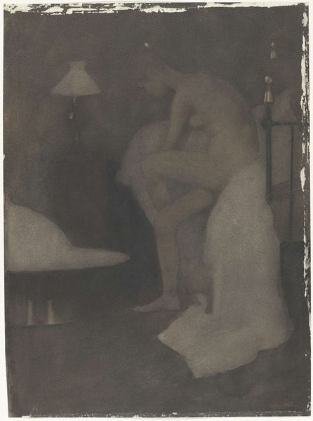 Vilhelm Hammershøi painted this "Standing Female Nude" with oil, probably around the turn of the last century. I'm immediately struck by the subdued palette and the way the paint seems to almost dissolve into the canvas. You can sense how he's searching for the form. It's like he is building it up from nothing. Look closely, and you'll see how Hammershøi layers thin washes of paint to create a sense of depth and atmosphere, especially in the background. It's not about a flashy surface or bravura brushwork; instead, it feels like he's after something more elusive and internal. There's a vulnerability in the figure's pose, a kind of quiet introspection. The way she hangs her head, it feels both sensual and melancholic. The ghostliness of the painting feels reminiscent of Whistler's tonalist works, in the way it strives for an emotional register beyond literal representation. It invites a meditative experience, which is one of the things that I love about art: its capacity to evoke feelings that can be hard to put into words.