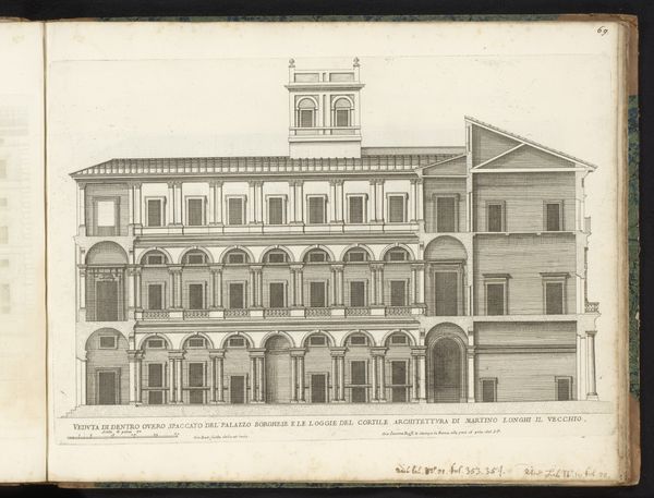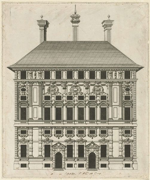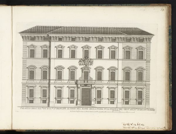 Editor: So, here we have "Façade van het Collegio Romano te Rome" from 1655, an etching by Giovanni Battista Falda, currently residing in the Rijksmuseum. My initial thought? It’s incredibly precise, almost architectural in its detail. It feels like looking at a blueprint frozen in time. What stands out to you when you look at this piece? Curator: Oh, that's the delicious part, isn’t it? It's more than a mere blueprint. Falda gives us Rome, right when the Baroque was throwing the best parties. This isn’t just a building; it's a stage! Notice the rigid structure softened by the curves over the windows, almost whispering 'drama.' And look at the light—the crisp lines defining every stone, a calculated dance of shadow and illumination that promises hidden depths. Do you get the feeling there is so much beyond this facade? Editor: I do see what you mean now, there is life and mystery in the composition. So it's a piece that reveals more about an era than just what the building looked like. It almost tells a story. But doesn’t the style seem a bit rigid to fully embrace Baroque sensibilities? Curator: Precisely! That tension—that slight discomfort you feel—is key. Falda walks a tightrope, balancing cool observation with theatrical flair. That rigidity you noticed provides a canvas, a structured framework upon which Baroque Rome could then project all its fevered dreams of power and illusion. What is the overall affect it has on you, really? Editor: That contrast really illuminates the time period now. I was so focused on the detail that I overlooked the bigger picture of Baroque dynamism contained in such strict lines. It feels so academic and alive now! Curator: And that, my friend, is the magic of art, isn't it? It shifts perspective, showing how structure can frame and elevate feeling, freezing a riot of a period into a perfectly preserved moment.