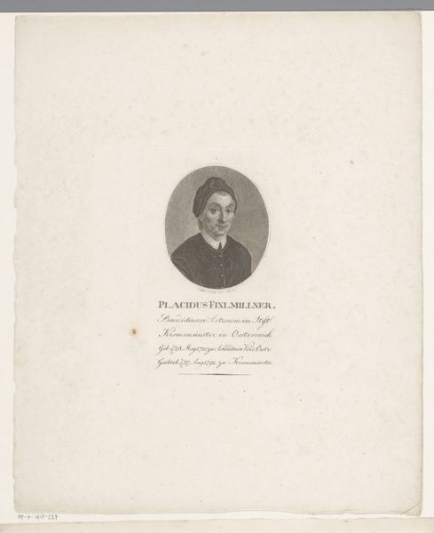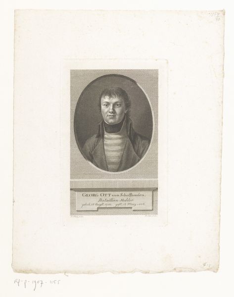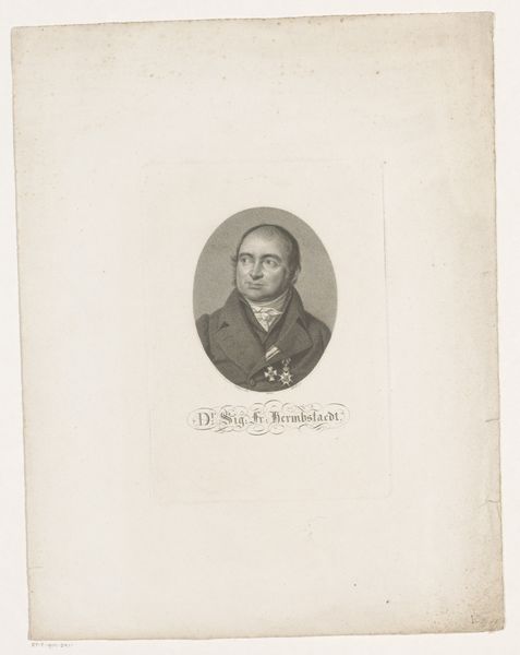Curator: Immediately striking is this soft, almost ghostly rendering. Editor: Agreed, it has a melancholic air, like a faded memory pressed between the pages of a very old book. Curator: The artwork is a portrait of Johann Wendt by Johann Friedrich Bolt, created in 1824. It is an engraving. Editor: Wendt looks a bit… stern? The gaze is direct, unyielding. I’m also fascinated by that medal pinned to his coat. What does it signify, do you think? Curator: Medals at the time were more than mere decorations. They often symbolized allegiance to the state and civic virtue and were deeply meaningful assertions of class and status. I read them almost as coded visual statements within these types of images. The stern expression you picked up on may also signify an association with leadership or valor. Editor: Absolutely. The oval frame and the tightly controlled lines certainly reinforce that impression of formality. It almost feels like a…visual restraint, which reflects the Neoclassical period nicely. The white palette is almost sterile, perhaps lending even further to a lack of warmth? Curator: Precisely. Look closely, though, at the use of line—so precise, each marking contributing to the overall form, an academic devotion to form. Notice how even the wisps of hair and delicate details around the face are rendered. Each mark shows his careful and realistic rendering of the sitter's appearance. This is more than just recording the likeness; it also shows ideals around rational representation. Editor: Right, but beyond the objective record, what survives in my view, despite the artistic approach or cultural context, is how the rendering manages to carry such a sense of dignity, even gravity. I am reminded of the kind of photographic portraiture from the 19th century, but rendered here on this earlier medium of an engraving. It carries the echo of another time and place. Curator: I concur. In delving into art, history, and the interplay of social markers, one cannot help but consider enduring motifs in the art over the years. Editor: These journeys back to a moment in time become like little philosophical experiments. I mean, they give you a chance to test drive historical context and see how it drives feeling today. Thanks!