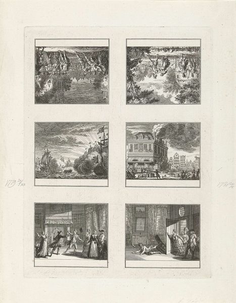 Editor: This is "Onversneden vel met zes voorstellingen waarvan vier van historische gebeurtenissen uit 1790", a print made by Cornelis Brouwer between 1790 and 1796. Looking at all these scenes crammed onto one sheet, I’m curious how they reflect the turbulent times. What historical context are we seeing in these vignettes? Curator: This print offers us a window into a pivotal moment, really several pivotal moments, during the late 18th century. Given the title, at least four scenes allude to significant historical events from 1790. Do you notice any recurring symbols or visual elements that might connect these events, providing a common socio-political message? Editor: The heavy presence of authority figures in what look like parliamentary settings or even battlefields are recurring elements. I think this really portrays scenes of power and hierarchy, maybe with a tone of criticism toward them? Curator: Precisely. These scenes highlight the power dynamics in play, particularly during a time of revolutionary upheaval. This sheet might be read as political commentary circulated during this time, shaping public perception, and even possibly shaping events on the ground. How might the decision to present them all on a single, uncut sheet affect the viewer's experience and interpretation? Editor: Placing these scenes side-by-side turns them into points within an argument, rather than isolated incidents. The artist, and subsequently the viewer, seem to engage with them together. Curator: Yes, and that deliberate placement turns the sheet into a piece that can inform our understanding of the public role of art. With prints being relatively easily distributed compared to other artworks, who do you think was Brouwer's target audience and how did this medium contribute to the wider dissemination of political ideas? Editor: I think the message could be spread further due to it being a print, thus Brouwer may have targeted the general public and not necessarily other higher up, wealthy figures. It allows for mass-consumption and influence, democratizing the discussion about historical and political issues. Curator: Exactly! Thinking about how these images were circulated and consumed helps us to better grasp the political influence of art during periods of societal transition. Editor: Thanks, it is interesting to view this work as an agent of disseminating particular ideologies in history. I’ll definitely view similar pieces in a new light now.