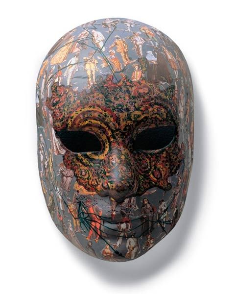 Joyce Kozloff made this mask, Voyages #55: Galapagos Islands, with paint, maps, and a real sense of adventure. The maps aren't just decorative; they become the very skin of the mask, charting not only geographical locations, but also emotional territories. I find myself drawn to how Kozloff merges the objective precision of cartography with the subjective experience of wearing a mask. The texture is key: the subtle bumps and ridges that suggest both the contours of a face and the uneven terrain of islands. I notice the way she uses a muted, almost fleshy palette, disrupted by those sharp, cerulean blue arrows, hinting at currents, directions, or maybe even personal journeys. It reminds me of the Pattern and Decoration movement, where artists celebrated ornamentation and craft. It's a reminder that art doesn't have to choose between intellect and beauty; it can embrace both with open arms, and a bit of mischievous play.