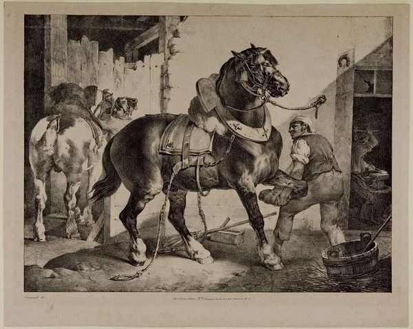 Théodore Géricault created this print of an English farrier, using etching and aquatint. The composition is immediately striking. Géricault positions the muscular farrier centrally, his body a dynamic diagonal against the more static, horizontal forms of the horses. This tension creates a visual push and pull. The monochromatic palette enhances the focus on form, shadow, and texture. We can see the rough textures of the stable's walls contrasting with the smooth skin of the horses. Géricault was fascinated by the depiction of animals and the working class. This print reflects an emerging interest in realism, moving away from idealized depictions to focus on the everyday. The semiotic here lies in the symbolism of man and animal—a relationship defined by labor and necessity. Notice the subtle interplay of light and shadow. Géricault uses aquatint to create tonal variations that add depth and volume. This enhances the realistic feel and invites us to consider the formal qualities. Art is more than just representation; it's an ongoing dialogue between form, content, and interpretation.