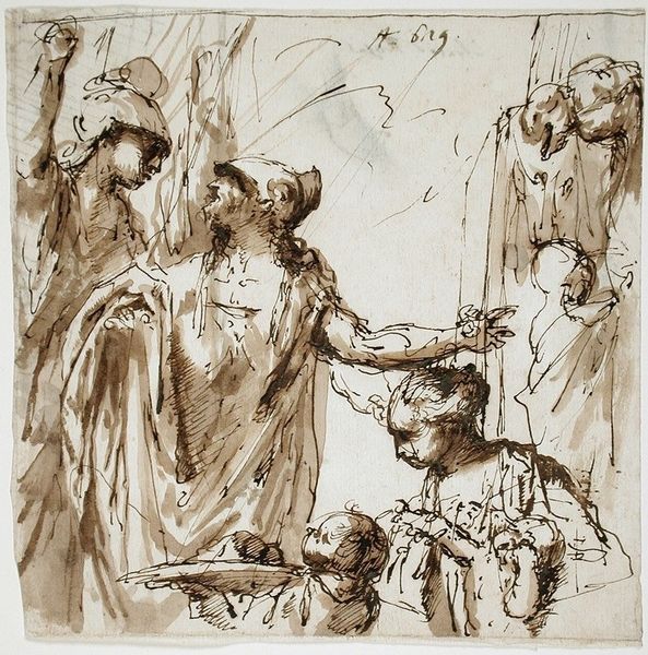 Editor: This is Washington Allston’s sketch, “Seated Woman Holding a Baby, with Two Figures Standing Behind.” The lines are so fluid! What can you tell me about how Allston's process and materials influenced this intimate portrayal? Curator: Notice the quick, almost frantic application of ink. This suggests a study, rather than a finished piece. How might the availability and cost of paper and ink at the time have influenced Allston's sketching habits and the scale of this work? Editor: That's a great point. I hadn't considered the economic factors influencing his art. Curator: Thinking about the materiality reminds us that art making is always embedded in specific social and economic conditions. What new details do you notice now? Editor: The visible paper fibers and the ink's texture suddenly seem much more deliberate. Thanks for pointing that out! Curator: Absolutely, it is the intersection of material and technique that makes art come to life.