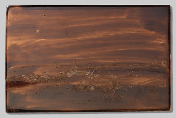 Curator: Julie de Graag's 1918 print, simply titled "Bloem," presents a compelling exercise in monochromatic landscape depiction. It’s currently held here at the Rijksmuseum. Editor: Immediately, I'm struck by its melancholic tone. The sepia palette and desolate scene evoke a sense of quiet introspection. The entire image plane, for me, functions like a dark mirror to the inner world. Curator: Precisely. Note the almost ethereal quality of the etched lines. They coalesce to form both water and grassy areas. It certainly lacks detail in representational form, but evokes a quiet power through its composition. How do you read its symbolism in the social context of 1918? Editor: One reads landscapes differently when looking back from periods marked by mass social upheavals, industrial change, or indeed wars. In the closing year of the First World War, there's a powerful undercurrent of devastation, I would venture, even if de Graag's landscape doesn’t depict actual battlefield destruction, but rather serves as a quiet response to an increasingly difficult moment in history for those back home, perhaps. Curator: It's worth observing the lack of sharp lines. The landscape seems to dissolve at its edges. It really pushes the limits of etching as a medium for capturing a vast, receding space, creating an ambiguous relationship between near and far. There's the constant invitation to complete its image with one’s own perceptions, in other words. Editor: And perhaps there's also a relationship between that incompleteness and how people might have struggled to piece together the larger political and social meaning during that period as well. Certainly, it gives one pause when looking back through a contemporary lens. Curator: Looking closely allows us to appreciate its compositional balance as a response to profound tension. I admire its nuanced and meditative exploration of space. Editor: It is a deeply considered, contemplative print – a document speaking of quiet desperation and careful resolve.