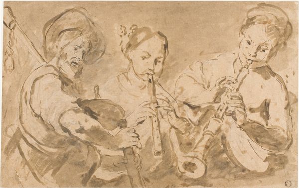 Curator: Welcome. Here we have "Musicians," a pen, ink, and pencil sketch on paper by Donato Creti, currently undated. Editor: My first thought is that it has an immediate, almost casual feel despite clearly being figures of some status. It's quick but also somehow elegant. The washes create lovely contrasts. Curator: Indeed. Creti, working in Bologna during the late Baroque period, had a very particular talent for capturing scenes of aristocratic life, often idealizing them to a great degree. It seems studies like these were crucial preparations for more grand-scale projects in public spaces that aimed to project power and sophistication. Editor: You can really see how this was a study, look at how the figures are all cropped rather low – only just at their shoulders. Creti is using expressive line work with such subtlety, implying volumes and textures without committing to detailed realism. The hats of the figure on the right are especially wonderful examples of this technique. It seems like there's an awful lot of visual energy here. Curator: I think it reflects a broader trend in Bolognese art where a new model of "virtuous" leadership was actively promoted through academies, galleries, and printed material. Visual art had the important civic responsibility to propose to the masses a specific system of social conduct. Editor: Are you implying there's an ideological underpinning? It seems strange to assign social significance to something so obviously playful, given the lightness of touch and relatively intimate scale. The focus seems primarily aesthetic—achieving balance, form, and emotional tonality. Curator: And you're right, obviously the sketch emphasizes the artistry, however in looking at all the evidence it is highly suggestive of propaganda! This kind of aesthetic style was adopted into paintings with powerful impact in large frescos that did carry direct political statements. Editor: Well, regardless of underlying purpose, "Musicians" shows Creti’s undeniable skills with ink, paper, and human expression. Curator: Yes, the dialogue between this preparatory, exploratory study and the grand narratives circulating in the socio-political sphere certainly enriches our appreciation.