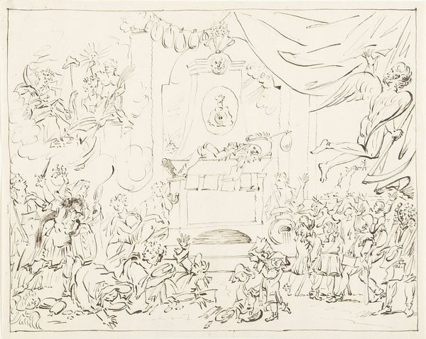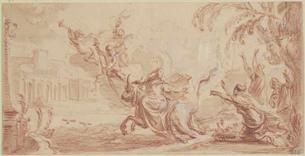 Curator: Here we have a striking sketch entitled "The Last Supper with Two Adoring Angels." It's attributed to Giovanni Battista Tiepolo. He worked with chalk, pen, and ink. Editor: It has a spectral, dreamlike quality. Figures emerge from the light like apparitions. The overall effect, though, is serene rather than frightening, which strikes me as curious for this particular scene. Curator: Consider Tiepolo’s artistic inheritance. His style belongs to the Venetian Rococo. Rococo style often veered toward decorative uses of complex figurative arrangements for noble and religious narratives. So, this may reflect more of an idealized heavenly scene. Editor: Still, you'd expect to find tension in a portrayal of the Last Supper, especially if seen within the history of suffering in the lives of so many people, not just then but across time. Yet these figures seem suspended, removed from reality. Are we looking at detachment here? Or reverence? Curator: I lean toward reverence, influenced by baroque conventions. The swirling compositions with dramatically posed angels, their upward gaze, all contribute to that feeling. Also, remember, it’s likely a preparatory sketch, where capturing the emotional charge might not yet be a primary focus, and instead, proportion and arrangement took precedence. The final artwork may well convey heightened drama. Editor: That’s true, this work could serve to examine some tension between sketches and finalized, ‘official’ versions. Does some spontaneity get lost between versions? Were individual gestures edited according to contemporary expectations? I see this as a moment in history where people used faith and artistic tradition to make sense of human suffering. Curator: I agree. The function of visual motifs played a huge part. Consider the widespread and sustained impact of a scene like the Last Supper as a way to manage fear. And look here—Tiepolo employed well-established iconographic elements to amplify the effect. Even in its incomplete state, you get a sense of the artwork's role in communicating, preserving, and shaping the social and spiritual outlook. Editor: Well, looking at it now, the artwork prompts questions about faith, historical artistic practice, and the complex emotional power of symbols. Curator: And I'm left wondering about how it may have affected the emotions and thoughts of people throughout history who were dealing with very difficult political and historical events.