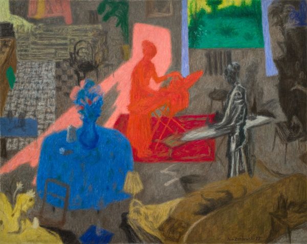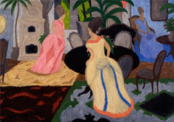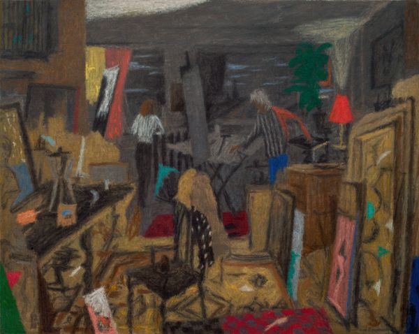 Editor: This is Iwo Zaniewski’s 2021 oil painting, "Ironing in the Bedroom." The colours are quite muted and the scene feels very domestic and almost dreamlike. How do you interpret this work? Curator: I see this as a powerful commentary on labor and gender roles within the domestic space. The "bedroom" suggests intimacy, yet the act of ironing disrupts that with its mundanity. How do you think the artist’s stylistic choices, like the muted colors and almost naive approach, play into that? Editor: They create a certain vulnerability, perhaps highlighting the unseen work and emotional labour often carried out within the home. The expressionistic style also adds to that sense of rawness and emotion, I think. Curator: Exactly. Consider the historical context – for centuries, domestic tasks like ironing have been largely relegated to women. Zaniewski seems to be making visible the often invisible labor that sustains a household. It invites a discussion about who performs this labor and what the social implications are. Is the scene, maybe, a space where traditional ideas are contested or challenged? Editor: It could be, particularly given the male figure performing the ironing. Maybe it's exploring shifts in those traditional roles? Or just observing modern domestic life? Curator: Or is it possibly addressing the invisibility of the service sector where men tend to dominate? Thinking critically about that subtext gives depth to our understanding. This act of observing everyday realities is actually pushing us to question the structures. It reveals a quiet, understated political dimension, doesn't it? Editor: Definitely. I initially just saw a scene, but now it's clearly a loaded portrayal of contemporary domesticity and gendered labor. Curator: It highlights the critical lens through which we need to approach art - by engaging with history and socio-political conversations to expand our understandings. Editor: Thanks, I never would have thought about it like that at first.