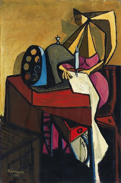 Curator: Take a look at this still life by Pablo Picasso, "Skull and Leeks," created in 1945. The oil on canvas has an arresting presence. Editor: The first thing that strikes me is the raw, almost brutal application of paint. There's a definite tension in the composition, with those clashing yellows and blues. It feels unresolved. Curator: That unresolved feeling mirrors the historical moment in which it was created, right at the end of World War II. The painting grapples with mortality against the backdrop of immense human suffering. It draws heavily on the 'vanitas' tradition. Editor: Absolutely, but what about the choice of materials? Oil paint provides a certain density and allows for layers to build up. You see how he uses it thickly in certain areas. The social context of a painting made with quickly drying and cheaper acrylic is just different. Curator: The skull as a symbol of death, and leeks, typically a sign of vitality, renewal, are thrown together; consider this against the legacy of conflict and human displacement. How does Picasso wrestle with existence when he doesn't see it as purely either/or? Editor: I am not quite convinced; to me the skull serves not merely as a symbol but more like a mass-produced item, a stand-in to explore form, perspective, maybe the painting itself. Picasso is less moved by high minded reflections of mortality. It's not merely philosophical pondering here, but something closer to how it relates to his studio practice and its many historical links. Curator: Well, I interpret this cubist rendering through a lens that is about interrogating history and the psychological impact of living under war. You're inviting a connection to its materials and industrial context. And maybe that intersection makes sense. Editor: Right, by zooming in on material and fabrication, maybe we have a framework to think about both Picasso's work and his worldview together. Curator: Agreed. Examining these still life objects through their cultural value as well as industrial origins opens up rich territory for understanding it, not just as art history, but an artifact that shapes a moment of social and political reckoning. Editor: Okay. I think looking at "Skull and Leeks" from these perspectives makes me respect its ability to invite and even maybe annoy people almost 80 years after its creation.