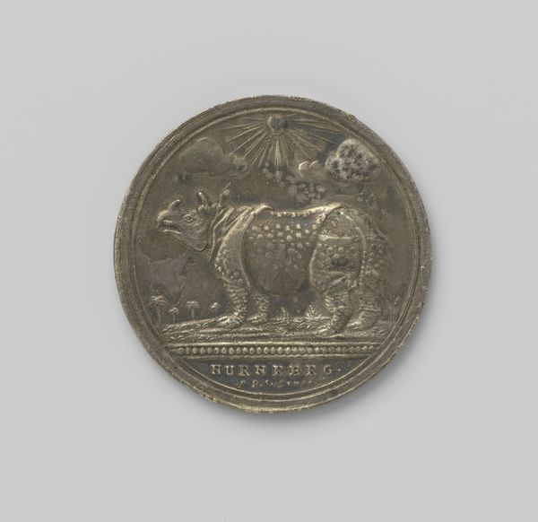 Curator: Here we have Victor Peter's "Medallion," created between 1895 and 1905. It’s a bronze relief sculpture, quite striking in its classical realism. Editor: There’s a dreamlike quality to it, even with the realism you mention. The smooth bronze gives the figures a soft, ethereal feel. Almost like a scene plucked from a half-remembered myth. Curator: Precisely! The choice of bronze lends a timeless quality, doesn’t it? And the composition, a nude figure with a deer, speaks volumes. The deer, throughout history, has symbolized innocence, gentleness, connection to nature, maybe the divine feminine. Editor: That connection to nature is interesting. The nudity, of course, historically used to represent the idealized male form, also links them both, the figure and deer, to an unsullied natural state, free from societal constraints, perhaps. Is there an intended allegory? Curator: Well, we can interpret it several ways. Peter may be drawing upon classical depictions of deities or heroes alongside their animal companions, conveying ideals of harmony, innocence, a lost paradise. The addition of the laurel branch furthers that sense of a more idealized realm, even some sort of hard won prize. Editor: The idyllic symbolism contrasts starkly, for me, with the colonial context of the late 19th and early 20th centuries. The pursuit of a return to innocence is perhaps in direct proportion to the awareness of growing world complexity. Was this an intentional rejection of industrial society? Curator: Perhaps a commentary, whether intended or not, on the perceived loss of purity in the modern world. Many artists in that era sought refuge in classical themes. So much rapid social change must have produced cultural amnesia, in which the work strives to restabilize collective norms. Editor: This piece almost feels like a bittersweet echo, the idealized nature existing side by side with the echoes of what was already starting to change, be exploited and potentially erased in their time. Curator: It is, and perhaps that’s where the artwork's lasting appeal lies. It's more than mere representation. It’s an echo chamber. The symbols resonate, triggering emotional and intellectual connections within us even today. Editor: Absolutely. It urges us to look beyond its surface and examine the complex relationship between nostalgia, progress, and the artistic quest for something enduring.