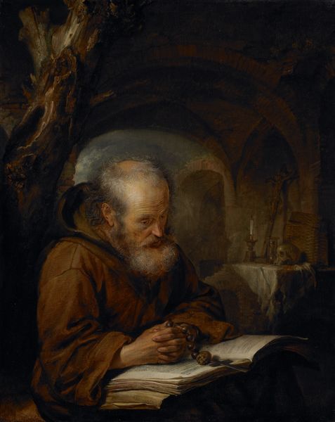 Curator: Salomon Koninck painted "An Old Scholar" around 1645. The materials, of course, are oil on canvas. My initial sense is one of deep concentration. The palette is quite restrained. Editor: It’s more than concentration, isn't it? The figure seems steeped in history and wisdom. The cap, the beard...these are powerful symbols. There's a weight to this image. What exactly was Koninck trying to portray here? Curator: Let's consider Koninck's influences; we have Rembrandt's workshop dynamic. There is a direct focus on capturing textures – the rough pages of the tome, the rich, if subdued, colors of his clothing, the wrinkled skin on his hands. I want to examine those material conditions. How would that parchment feel? Editor: For me, that parchment represents the written word, accumulated knowledge passed down. He holds a quill; he literally holds the power to contribute to that narrative. That globe next to him? It reinforces a sense of encompassing, universal knowledge. The man is an icon of learning. Curator: That may be true. But Koninck was a part of the second generation of Rembrandt's workshop. How were his methods of painting influenced? What sources of pigment did he use? Where was his studio, and how would he get his materials to begin with? Was it the same shop and street Rembrandt had previously used? I imagine there was shared suppliers, with the older artist’s demand increasing market value for others... Editor: Yes, but regardless of the studio practices or market pressures, this image taps into something timeless. Think about the symbolism: The act of writing, of recording, bestowing knowledge. Look at other examples of “the scholar” through the history of painting... Aren't there many overlaps, visual cues handed from artist to artist? Curator: Ultimately, it all circles back to material means and conditions – these traditional materials are repurposed towards representing cultural knowledge in visual form, whether you are studying a portrait or even considering “genres.” Editor: And those genres resonate, Curator. The man looks away as though divinely inspired! Curator: Perhaps what this has taught us is how historical narratives continue to be crafted, re-crafted, repurposed, so much so that the materiality itself adds more to the experience... Editor: I agree, seeing through both of our lenses enriches the understanding. I now can see the "means of making" and acknowledge that labor too adds to the historical symbolism.