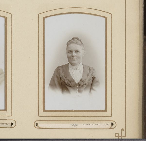 Curator: So, here we have "Portret van een jonge vrouw", or "Portrait of a Young Woman," a gelatin silver print produced sometime between 1890 and 1910 by Atelier Apollo. Editor: It’s subtle. At first glance, just a young woman. But the softness, that ethereal glow...it's like she's caught between worlds, a whisper from a bygone era. There's something haunting, melancholic. Curator: Precisely. The use of gelatin silver aligns with the rise of Pictorialism, a movement pushing photography towards artistic expression, moving beyond mere documentation. This aesthetic aimed to give photography the emotional resonance and ambiguity of painting, fitting into debates around photography's place within high art. Editor: Right! That makes so much sense. That deliberate blur softens every edge. She's real, yes, but almost…idealized. It is very painterly actually! Almost like the pre-Raphaelites. Do you think there are symbolic or allegorical purposes for such kind of portraits during this period? Curator: Indeed. Many portrait studios would emulate the popular styles in painting, providing a tangible aspiration for sitters wanting to align themselves with certain cultural values or class aesthetics. Also, keep in mind that owning such photographic portrait allowed middle class people to own art! Editor: I hadn't considered that democratization aspect! Still, looking at her...those knowing eyes...I keep wondering about her story. Who was she? What dreams did she carry? You know, I like how the frame looks antique-y; I think it really enhances that nostalgic sentiment you talked about. Curator: Well, sadly, the specifics of this young woman are lost to history, she stands in for countless others. A relic and witness of social shifts during photography’s rapid development. Editor: Ah, well. Maybe it’s better that way, allows each of us to create our own stories for her. It really shows how one image can encompass whole universes. Curator: Indeed. And seeing its reception, that's art's fundamental appeal isn’t it? A window to shared and intensely personal readings of a society’s imagination.