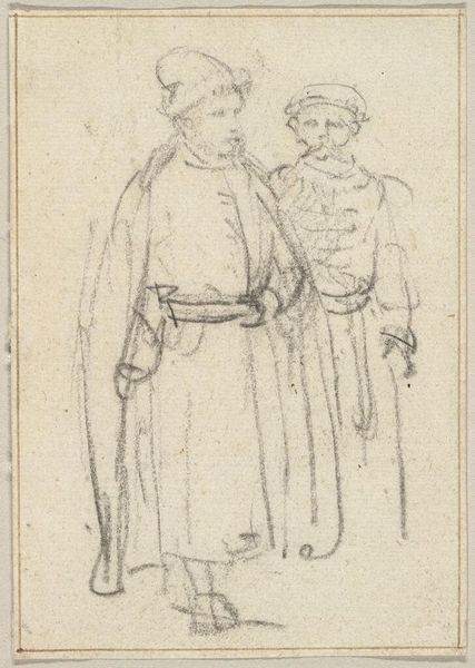Editor: This ink drawing, titled "Twee staande Oosterse figuren" which translates to "Two Standing Oriental Figures", was created sometime between 1580 and 1650 by Hendrick Goudt. The quick, almost nervous lines give it a really unique feel, a sense of capturing a fleeting moment. What strikes you when you look at this piece? Curator: Well, first, those "Oriental figures" immediately take my mind on a wild, time-traveling carpet ride. Goudt, like many artists of his time, was captivated by the "exotic" East. It’s like he's peering through a keyhole, isn't it? But instead of precision, we get this swirling energy. I think, what story is Goudt *really* trying to tell here? Is it about the East or his own fascination? What do *you* make of the back figure? Editor: He looks so… unfinished. Like a ghost, or a memory fading. It makes the first figure seem even more solid, more present. Curator: Exactly! And consider this - he only suggests detail, but your imagination does the heavy lifting! He trusts you, almost as a collaborator, doesn't he? Are you picking up any tension within their gazes, poses, or even within his technique? Editor: Definitely tension in the lines. It’s loose but purposeful. It definitely sparks curiosity about their relationship. I also notice a sort of lack of confidence? Perhaps that’s in me and not the painting! Curator: I get you. It’s that imperfection, that touch of vulnerability, that makes it so intriguing. It's like he's whispering a secret, not shouting a proclamation. A cultural moment filtered through Goudt’s hand. Editor: That imperfect lens gives the figures a whole new dimension. I am seeing new elements now!