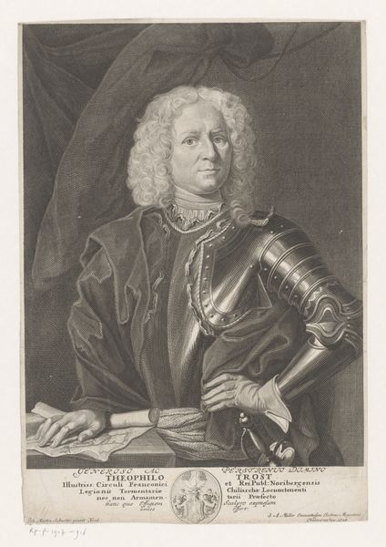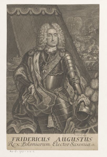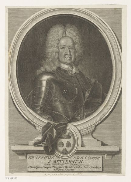 Curator: My goodness, what a wig! It’s practically its own ecosystem up there. Editor: Indeed. We’re looking at a print from 1730 by John Faber II, titled "Portret van August Wilhelm von Braunschweig-Lüneburg." An impressive, formal affair. Curator: Formal is putting it mildly! I mean, the armor, the sash… it all screams, “Don’t mess with me, I own a very large estate.” And that subtle smile! What's he thinking, I wonder? Plots, dreams, maybe just what to have for dinner? Editor: He was, of course, Duke August Wilhelm, so considerable political power would have been expected. The piece speaks volumes about the performance of power and prestige in the Baroque era. How one was expected to present. That determined so much of social reality. Curator: Right. And Faber really captured it – that weighty expectation. Even in print, you feel it. It's strange, though, isn't it? Knowing this portrait probably shaped how people perceived him…maybe even more than reality did. What if he was a sweetheart who secretly collected stray kittens? Editor: Well, kittens might undermine the image somewhat. Consider, also, how prints like this circulated. This wasn't about individual, artistic genius in a gallery. Prints democratized imagery; Faber's work cemented a visual understanding of power across a wider social landscape. They were key to political imaging. Curator: That makes sense. Mass media of the 18th century, in a way. And here we are, still looking, still deciphering the signals sent across three centuries. Editor: Precisely. Images and their messages continue to exert a potent force, even now. A powerful, if indirect legacy, in itself. Curator: Gives you something to think about, doesn't it? Editor: It does, indeed. A small paper artwork with a large impact.
