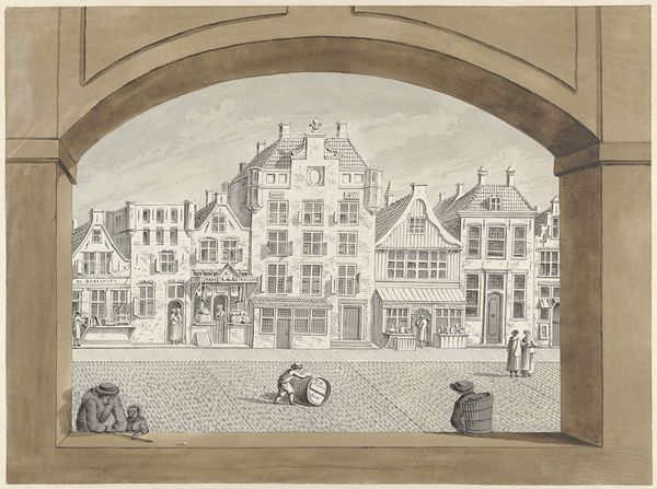 Editor: So, this drawing, “De Koopmanshal in Middelburg” by Dirk Verrijk, from sometime between 1744 and 1786... It’s done in ink on paper, and the details are just incredible. I'm really drawn to how he framed the market square, almost like a stage. What catches your eye? Curator: It's fascinating how the artist captures the spirit of commerce within the symbolic framework of the city. The Koopmanshal, the merchant's hall, stands as more than just a building. Think of it as a representation of prosperity and civic pride. What emotions do the details of the figures evoke? Editor: They look busy, some trading, others maybe just observing. They’re part of the everyday hustle and bustle of the market. But how much of this scene is factual versus idealized, you think? Curator: Consider the symbolism inherent in marketplaces. Historically, they've been spaces for exchange, both material and social. Verrijk seems to acknowledge this continuity by highlighting not just the goods but also the figures, each carrying their story within the collective narrative of Middelburg. Do you notice how the framing device contributes to this effect? Editor: Definitely, it's like a window into another time, or maybe a carefully constructed memory of it. Thanks, that makes me think differently about cityscapes now. Curator: Indeed. By understanding how an artist uses visual language, we can truly decipher the complex messages about culture and history, memory and emotion.