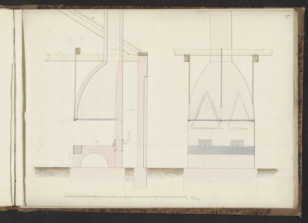 Editor: This is "Voorgevel en doorsnede van een gebouw met twee waterspuwers," which translates to "Facade and section of a building with two gargoyles," by Willem Springer Jr., likely made between 1825 and 1907. It’s a drawing made with ink on paper depicting the architectural structure of a building. I’m really drawn to the clean lines and the way the artist has depicted both the exterior and a cut-away view. What do you see in this piece? Curator: The intrinsic value of this piece lies in its representation of architectural form. Note the stark contrast between the shaded facade and the skeletal cross-section, revealing the building’s inner structure. Springer uses line weight strategically, defining the building’s outline with heavier strokes while employing delicate hatching to suggest volume and texture. The geometric precision is undeniable, particularly in the arches and the roof’s apex. Editor: Yes, I was fascinated by that contrast – it’s like two artworks on one page! The cross-section almost looks like an X-ray. Curator: Precisely. The drawing achieves a spatial dynamism through this duality. The use of negative space is also notable; the unadorned areas focus the eye on the building’s geometry and structural integrity. Does the regularity of form suggest anything to you in relation to the artist’s intention? Editor: I suppose that, given its objective and realistic qualities, he wanted to capture architecture as it truly is without embellishment, focusing on the pure design. Curator: I concur. Springer presents us with the essential framework, inviting us to contemplate the beauty inherent in structure and proportion. It’s an elegant example of realist representation that favours detailed execution over artistic license. Editor: I hadn't thought about the realism so directly before. Now I see that focusing on these intrinsic design elements adds so much to appreciating the work. Curator: Indeed, analyzing the composition in such detail can yield profound insights into the artistic intent and the subject matter itself.