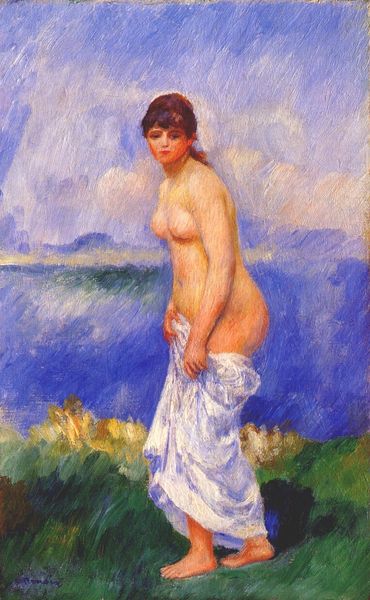 Pierre-Auguste Renoir created this oil on canvas painting, Nude Bather Seated by the Sea, capturing a scene dominated by gentle curves and soft, diffused light. The nude figure, rendered with delicate brushstrokes, melds into the surrounding landscape, creating a harmonious balance between the human form and nature. The water, with its muted blues and greens, echoes the fluidity of the bather’s posture. Renoir’s approach to form and composition here reflects his interest in Impressionism. He dissolves clear lines, opting instead for a play of color and light. The background, a simplified landscape, directs our attention to the bather, but does not isolate her. Instead, it suggests an integration of body and environment. This work, with its subtle application of color and emphasis on natural forms, seems to challenge traditional academic values which focus on idealized human form. Renoir invites us to see beauty in a more intimate, less structured manner. Note the expressive brushwork, where the individual strokes contribute to the overall impression of light and movement.