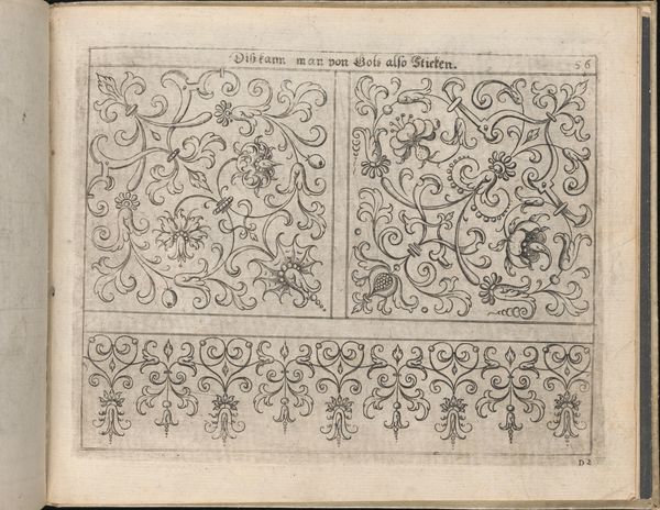 Curator: Well, look at this lively page! This is a print titled "La Vera Perfettione del Disegno di varie sorti di recami, page 30 (recto)," created by Giovanni Ostaus in 1567. It's an engraving, part of a book showcasing designs for embroidery, I think, and it's just brimming with Renaissance exuberance. Editor: Exuberant, certainly, though that term almost feels quaint to describe it. It's a high contrast decorative element from a page, so densely packed, a playful chaos rendered in precise lines. Curator: Exactly! Ostaus packs the frame with three horizontal friezes. The top one has birds, sort of monstrous yet endearing birds...Then a playful middle, full of these tiny cherubs pulling a bear along, of all things! Below that, an ornamented line with lush plant life with a central vase. I wonder about that procession and the bear—is that from somewhere specific, some tale everyone knew back then? I almost want to cheer them all on. Editor: That middle register functions structurally to invert the traditional figure/ground relationship. Look at how the tight network of linkages among the figures becomes the primary plane. The background, in turn, only exists to separate each group of cherubs from each other—or in the middle from the bear. Without that stark contrast the playful actions would likely get lost. It is indeed captivating. Curator: A little theatrical, isn't it? Almost like a scene from a masque. This isn’t mere decoration; there’s a story, or stories, being hinted at, if you dig deep enough. Or, who knows, maybe it's pure whimsy. It doesn't have to mean anything to be pleasing to look at. Editor: Precisely, a story hinted at. One almost doesn't need to grasp the intended meaning to appreciate how it operates at a compositional level. Consider the arrangement of elements across each band, and how the composition offers not only narrative engagement but decorative refinement. And note the almost hypnotic repetition; a precursor of graphic design. Curator: I think, in the end, whether it’s instruction or a dance of the imagination, this print does exactly what it promises: displays a 'true perfection of drawing’ and that can give joy centuries later. Editor: Yes, “true perfection” maybe understood in both its rigorous rendering and how it invites a reader's imaginative contribution across time.
