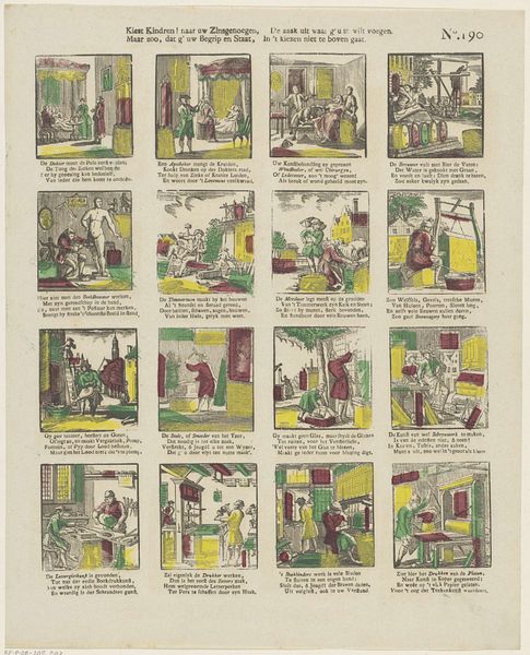 Editor: Here we have a print from between 1833 and 1900, attributed to Glenisson & Van Genechten, titled "Kinders wilt u vreugd vermeeren, / En in deze prent studeren / Snyt ze uit fraei na de zwier, / En plakt die dan op styf papier". It’s an engraving featuring small, sequential scenes. I’m initially struck by how this piece, seemingly for children, utilizes storytelling. What underlying messages about societal structures do you observe in its composition? Curator: That's an astute observation. The division into these small vignettes provides a framework not just for narratives, but for conveying values. Consider the title – it speaks of both joy and study. Isn't this a loaded pairing? What does it mean for children to be instructed on joy? The imperative within, is "Kinders wilt" which implicates the children as not subjects who freely experience and express joy, but active actors of that experience that demands their active participation, framing their very beings as subject to the patriarchy that sees fit to assign this demand unto their shoulders. Also consider the social and economic context of the time - folk art and genre paintings were being consumed across very diverse audiences, each engaging in its own way according to class, level of education, geographical region. How does the combination of folk art, sequential scenes, and implied moral lessons impact children encountering this piece? Editor: So, it wasn't just about amusement but about teaching them to internalize societal norms? Curator: Exactly. This could range from expectations surrounding behavior, domestic roles, class consciousness, etc. How do you think contemporary critical theory might dissect the visual narratives presented here in order to reveal these social dynamics? Editor: Well, perhaps analysing which figures hold power within each frame, examining who is centered, who is marginalized, and also examining what behaviors and objects these figures are interacting with and/or acting out against to reveal dynamics in line with existing power structures. Curator: Precisely. The work prompts a necessary dialogue about art as a powerful force in shaping, perhaps even subtly, our understanding of the world. Editor: It’s made me look at it in a completely different light! It goes beyond just being a collection of pretty scenes. Curator: Indeed, it showcases how even seemingly innocuous pieces can act as a reflection, and sometimes a reinforcer, of cultural expectations and power dynamics.
