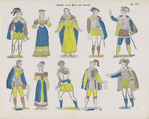 This hand-colored engraving entitled 'Othello of de Moor van Venetië' was created by Lutkie & Cranenburg. Here we see the various characters of Shakespeare’s Othello rendered through their distinctive costumes. Theater in the Netherlands has a rich social history, and in the late 18th and early 19th centuries, popular dramas provided a crucial space for the expression of national identity. What we see on display here are the costumes that would have made Othello legible to a contemporary audience. It’s interesting to note that the attire is not particularly Moorish. Instead, the production relies on a common European Renaissance vernacular of dress, but exaggerates it to delineate character. Historians interested in the production of Shakespeare in the Netherlands would find this print a useful artifact of theater history. We can see how meaning is created through visual codes, in this case, the cultural associations of garments.