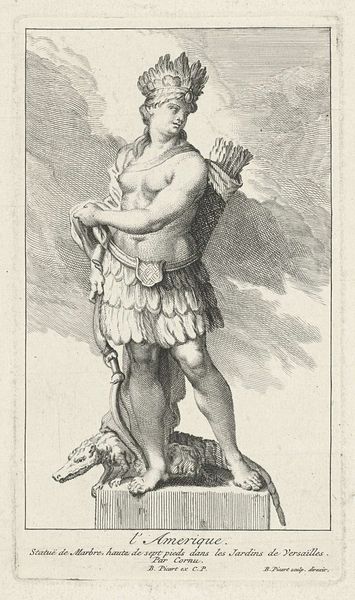 Editor: This is an 18th-century print titled "Hab.ts de l'Isle Marquises" from playing cards "Jeu d'Or," by an anonymous artist. I'm immediately struck by how it blends observation and imagination in portraying this figure from the Marquesas Islands. What symbolic significance do you see embedded in this image? Curator: It’s fascinating how playing cards became vehicles for circulating ethnographic images. The figure, adorned with feathers and wielding a peculiar object, carries the weight of early European perceptions of the "exotic." The feathers themselves—look at their colours!—are not mere decoration, but potent symbols of status, power, and connection to the spirit world in many cultures. How do these visual cues inform your understanding of cultural exchange, or perhaps, misinterpretations, during this era? Editor: I hadn’t considered the misinterpretations! The strange object he holds looks almost like scales, but out of place. Does this relate to European colonial intentions? Curator: Precisely. What appears "out of place" might reveal anxieties surrounding trade, power dynamics, and attempts to understand foreign societies through a European lens. Consider how the surrounding text interacts with the image: how might the combination create and reinforce colonial narratives? Are these romantic notions of the “noble savage?" Editor: The text, combined with the image, seems to simplify and exoticize the Marquesan culture for a European audience. I can see how the imagery is designed to portray this person as powerful, yet, also subjugated. Curator: Indeed. Cultural memory is encoded into these images. The combination reveals much about the relationship between colonizer and colonized, and how visual culture contributes to this dynamic. Thank you for enriching our reading of it! Editor: Thank you. It’s given me a lot to think about regarding how cultural narratives get embedded and transmitted through everyday objects.