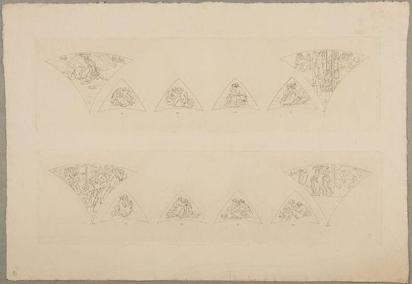 Editor: This is Eric Gill’s "Calvary, Five Stalks of Leaves, and Ship," part of the Tate collection. The stark black and white imagery gives it such a monumental feel, even in this small size. How do you interpret the symbolism at play here? Curator: Notice how Gill uses the triangular shape itself, mirroring the Trinity. Each symbol - Calvary, the leaves, and the ship - represents a different facet of spiritual journey: sacrifice, growth, and voyage. What feelings are evoked when you examine the 'PROCRESS' inscription on the ship's sail? Editor: It gives me a sense of movement, progress, but also destiny. Like the ship of life. Curator: Precisely. The symbols aren't merely decorative; they're deeply interwoven with Christian iconography and human experience. Together, they form a powerful narrative. Editor: I see that now. I had no idea such a small work could contain so much! Curator: Indeed. Gill's work is a testament to the power of visual shorthand, revealing cultural memory within simple forms.