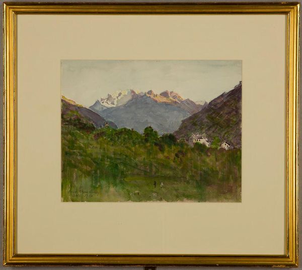 Curator: This is Denman Waldo Ross's "Mountains," housed here at the Harvard Art Museums. It strikes me immediately as a study in cool tones—a tranquil landscape rendered in watercolor. Editor: Tranquil, perhaps, but I see something more. The power of the mountains against the smallness of the structures at the base. It speaks to themes of scale and human impact. Curator: The artist's focus seems primarily on the interplay of light and shadow across the peaks. Note the almost impressionistic brushstrokes that define form. Editor: But what about the politics of landscape? Whose land is this? Who gets to represent it? Ross's view is almost certainly from a privileged, outsider perspective. Curator: A valid point, yet the painting itself offers a masterclass in compositional balance. The layering, the subtle shifts in hue. Editor: Perhaps. But art doesn't exist in a vacuum. It reflects and reinforces power structures, consciously or not. Curator: I appreciate the different lens through which you analyze this work. Editor: And I find your analysis of pure form useful too, if incomplete.