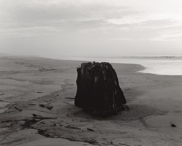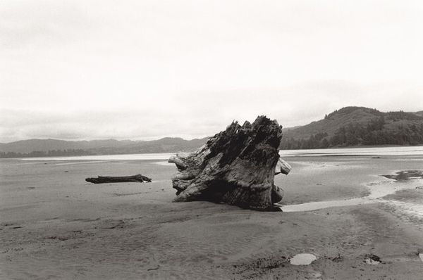 Editor: Robert Adams' photograph, "The River's Edge," created in 2015, really struck me with its stark, grayscale palette. It has this solitary tree stump in the foreground. There is an overcast sky and, distant mountains create this sense of almost post-apocalyptic quiet. What do you see when you look at this piece? Curator: Ah, yes, it sings to me of the beauty in decay. Adams often uses grayscale to really strip away the artifice and find the truth in landscapes altered by humanity. This stump, isolated like that, isn't just a leftover piece of wood, but a monument to a past life, a lost ecosystem. Almost feels like a poignant memento mori, don't you think? Does the starkness almost echo in your soul? Editor: It definitely does! I think what's interesting to me is that, in a way, it is sort of hopeful, right? It's still *there.* Do you think Adams was trying to create some sort of emotional tension through his choice of scene? Curator: Precisely! Tension is the artist’s instrument, like a tightly strung violin string! Think of this: the barren landscape speaks of what’s been lost, and how. It's an elegy to nature but the enduring form of the stump speaks to the persistence of life, even after trauma. Perhaps he’s asking us to look beyond the immediate devastation to see potential, resilience... What remains after the torrent is still the very land where things grow anew. Editor: I hadn't really considered that aspect of rebirth within something seemingly so bleak. Thanks for that. It definitely gives a new, more nuanced read on the photo. Curator: Anytime. The River’s Edge reflects on both what is missing but moreover it is an invitation to imagine what can return. A testament to how landscape both suffers *and* persists.