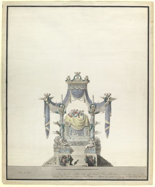 Curator: Ah, yes, "Catafalque of the Empress Catherine the Great of Russia (Side Elevation)" conceived in 1796 by Vincenzo Brenna. Look at the sheer monumentality rendered in pen, pencil, and watercolor! What's your initial read of it? Editor: Foreboding, actually. And oddly airy for something about death. All that white space around a rather extravagant, neoclassical display of grief, or rather, mourning. The colour is restrained, not really funereal in the typical sense, what do you make of the staging? Curator: For Brenna, staging was everything, a chance to sculpt the collective memory. Those precise lines! Neoclassicism reaching for immortality through perfect form. I sense an effort to render power and, well, control through order. Even in death. Editor: Absolutely, power. Check out the symmetry—mirrored cherubs, paired busts—the insistent repetition. Is there some significance in its incompleteness though? It doesn’t look quite finished. The etching looks faded. Curator: Perhaps that enhances the emotion, creates a visual incompleteness in this space that gives room for interpretation? It also seems to underscore Catherine's unfinished business, perhaps even Russia's ongoing transition? Editor: Hmm, transitions. So that’s like these angelic figures looking like they’re ushering her into the afterlife or some sort of spiritual transcendence. This drawing captures something deeply ambivalent. It’s not simple mourning, but really a celebration, a stagecraft that seems so distant from intimate grieving. It’s so stylised! Curator: Agreed, Brenna, always thinking of posterity! And the composition leads your eye directly to what would have been her remains in state. Every detail, from the friezes along the base to the swagged drapery, speaks to empire. All in these very subtle colours, though, and it feels so different from what I was expecting, it looks more celebratory and a less obviously emotional representation. Editor: That is its beauty though, how this architectural proposal encapsulates this transitional period of life and legacy through perfect geometry and carefully placed symbolic touches, it’s really clever. Curator: It certainly prompts a dialogue, doesn't it? Between grandeur and the personal void.