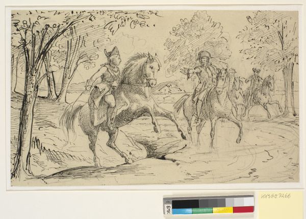 Editor: This pen and ink drawing from between 1810 and 1873 is titled "Sancho på æslet forklarer Don Quixote noget" by Wilhelm Marstrand. The light sepia ink gives the whole scene a dreamy quality. The figures of Don Quixote and Sancho Panza are so iconic; what do you see when you look at it? Curator: Immediately I see a story about contrasts: The idealistic knight astride his steed versus the grounded squire on his donkey. The very *choice* of animals speaks volumes, doesn’t it? One gallops towards a dream, the other trudges along, perhaps a bit wiser. What do you think that visual contrast tells us? Editor: Well, it shows how different they are, even though they are travelling together... Curator: Precisely. Marstrand isn't just illustrating Cervantes' story. He's using symbolic language, echoing age-old depictions of folly versus prudence. Don Quixote, with his armor and lance, embodies romantic, perhaps reckless, idealism. Sancho Panza? Practicality itself, a bit world-weary, pointing out a *sensible* direction. And remember, the Romantic period often used history as a way of reflecting on the *present*. Editor: So, Marstrand might be commenting on Danish society through these figures? Curator: Absolutely. Consider: Is he gently poking fun at blind ambition, or celebrating the visionary spirit, even with its potential for delusion? Look closely at Sancho's face, and Don Quixote’s posture. Are we meant to laugh with them, or at them? The artist invites us to question which path – the pragmatic or the fantastical – truly leads us forward. Editor: I never considered how the choice of animals could add so much meaning. I was just seeing a scene from a novel. Curator: Visual symbols create echoes across centuries; these characters gain new nuances with each telling. I am going to need to re-read Don Quixote now!