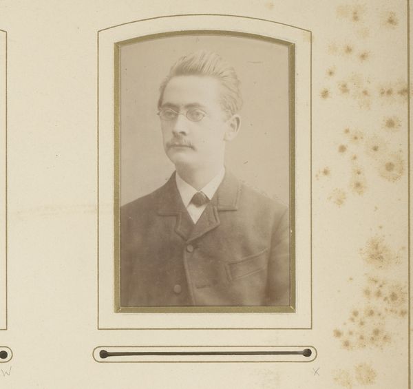 Curator: Here we have "Portret van een man met snor," or "Portrait of a Man with a Moustache," created between 1877 and 1900 by Jan Goedeljee. It's a gelatin silver print. What strikes you immediately about it? Editor: He looks… vaguely apologetic. Or perhaps just deeply serious in that uniquely Victorian way. The oval frame feels like it’s pressing him, capturing a moment of quiet vulnerability. It makes me wonder about all those other untold lives of men during the late 19th century. Curator: That’s a great observation! The seriousness is typical of portraiture from that era. Photography was still relatively new, a formal affair often imbued with middle-class aspirations and social status. His posture, clothing—the very carefully styled moustache—speaks to a constructed identity for public consumption. Editor: The sepia tone really sells it. I wonder, did he approve of this version? I can't help feeling some empathy, because sitting like that looks rigid and boring to me now! It might be more about what the artist, Goedeljee, wanted than the individual man. Curator: Exactly. Goedeljee was a prominent photographer, and it's through his lens, both literally and figuratively, that we encounter this subject. We're witnessing not only a man but also the aesthetics and conventions of 19th-century photography—its inherent power dynamics, for one. The portrait conforms to established ideas of bourgeois masculinity and displays its outward signs: seriousness, sobriety, control. Editor: Is that seriousness a burden or a badge? The weight of expectations seems embedded in every dark-brown shadow. I mean, maybe that ‘stache was his personal declaration of individuality within such restrictions? Curator: Precisely! He might not have been aware, however, of contributing to broader social narratives. But these early photographs, however unassuming they might seem, helped construct ideas of self, gender, and belonging that endure even now. He might be both asserting and conforming to the norms. It’s a negotiation played out through the photograph, through posture and gaze. Editor: Thinking about the artist, there’s a layer of intimacy removed by that constructed-ness, though—because ultimately you wonder about all that’s not revealed or accessible. Which seems sort of tragic now, I guess? A perfect photograph of imperfect honesty. Curator: It does highlight the distance that still remains. A small sepia-toned echo across time, revealing our shared past—and the ways we’ve both changed and stayed exactly the same.