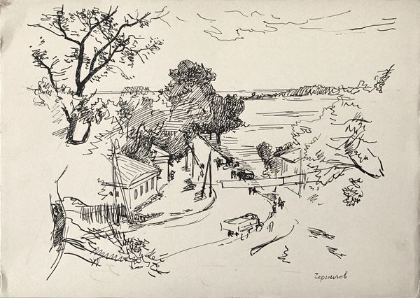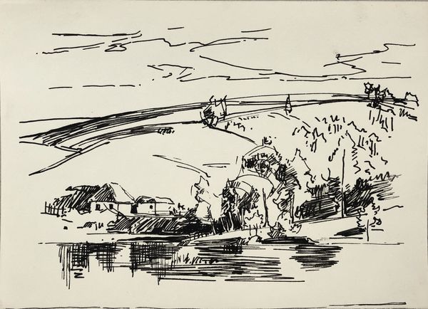 Editor: This ink drawing, “Landscape with houses. Stebliv (?)”, was created by Hryhorii Havrylenko in 1956. I’m immediately drawn to its simplicity and the quietness of the scene. What stories do you think this landscape holds? Curator: The tranquility you observe belies a complex history. Considering it was drawn in 1956, we need to see this “Landscape” through a Soviet lens. Post-Stalin, but still within a system that dictated artistic expression, Havrylenko’s choice to depict a rural scene becomes a subtle act of resistance. It’s an assertion of Ukrainian identity, rooting itself in the land when urban, industrial progress was the mandated subject. Editor: Resistance, really? It feels so… gentle. Curator: Exactly! It's gentle precisely because outright opposition was dangerous. Think about what’s *not* shown – no collective farms, no grand industrial projects. The focus is on individual dwellings, perhaps hinting at a yearning for personal autonomy, for a return to traditional ways of life erased by Soviet collectivization. What does that style of line work suggest to you? Editor: It’s very free, almost like a quick sketch. I guess that freedom could be seen as pushing back against the rigid artistic guidelines of the time. Curator: Precisely. Even the medium – ink on paper, suggesting a personal sketchbook – moves it away from monumental, state-sanctioned art. This small work becomes a quiet testament to enduring cultural memory, a soft whisper of dissent disguised as a simple landscape. Does that change how you view it? Editor: Definitely. I hadn't considered the political undertones at all. It makes you wonder what else is hidden in plain sight. Curator: It’s a reminder that art, even seemingly simple landscapes, can be powerful acts of cultural preservation and subtle defiance. And that’s a perspective that matters profoundly today.