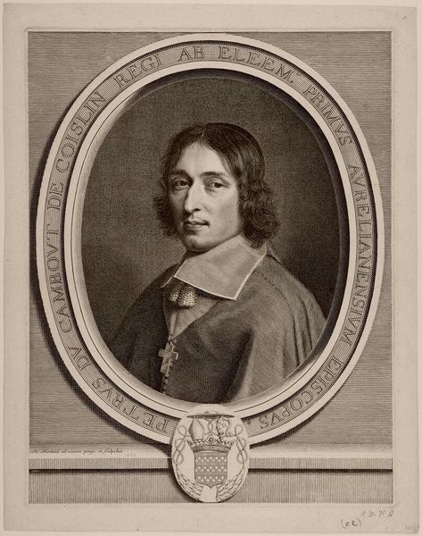 Curator: This is Robert Nanteuil's portrait of Charles-Maurice Le Tellier, the Archbishop-Duke of Reims. I find it striking how it captures the gravity of his position. Editor: It's quite austere, isn't it? Mostly grays, with the textures meticulously etched. The material feels almost...deliberately unflashy. Curator: Precisely! The lack of color heightens the focus on Le Tellier's face and the intricate details of his vestments and the inscribed oval frame. It's like Nanteuil is saying, "Look at the labor, look at the *weight* of office." Editor: Yes, the *weight* is palpable. The texture suggests labor but also maybe the social burdens, the cost of maintaining that status. Who were these prints for, I wonder? Curator: Probably for distribution among his circle, a way to broadcast his authority, to cement relationships... Editor: That makes sense. It’s more than just a portrait; it's a carefully crafted statement about power, influence and the means to reproduce it. Curator: Indeed. It's fascinating how much we can read into a seemingly simple image. Editor: Absolutely, there's always more than meets the eye once you start digging at the process and purpose.