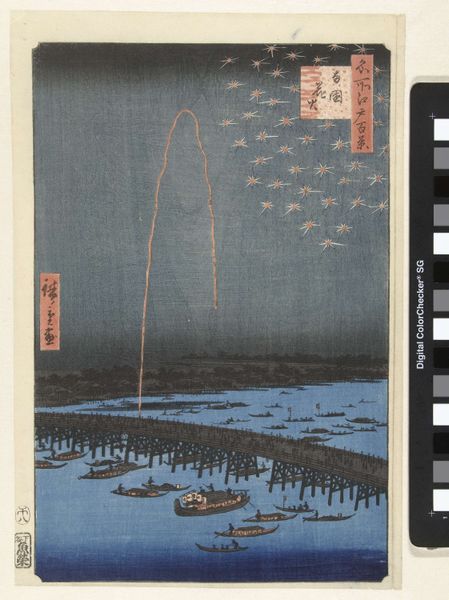 Curator: "Fireworks at Ryogoku" by Utagawa Hiroshige, part of the series "One Hundred Famous Views of Edo," captures a bustling scene during an Edo-period summer festival. Editor: I’m struck by the composition—the bridge bisecting the scene, the fireworks creating these spidery bursts of light—it’s a dynamic yet strangely serene image. Curator: Indeed. Ryogoku Bridge was a vital thoroughfare, and these fireworks festivals were significant social events. Hiroshige depicts not just entertainment but the city's vibrant culture. Editor: The linear precision of the bridge juxtaposed with the ephemeral fireworks is fascinating. It highlights the fleeting nature of spectacle against the solidity of infrastructure. Curator: These festivals were heavily regulated by the shogunate, yet they provided a sanctioned space for collective joy and social mixing across class lines. Editor: Considering the limited palette, the artist masterfully conveys depth and atmosphere through line and texture. A visual delight! Curator: Understanding the socio-political context allows us to appreciate how Hiroshige used these "famous views" to reflect on Edo society itself. Editor: It's a successful marriage of form and content, offering us both a glimpse into a specific moment and enduring artistic beauty.