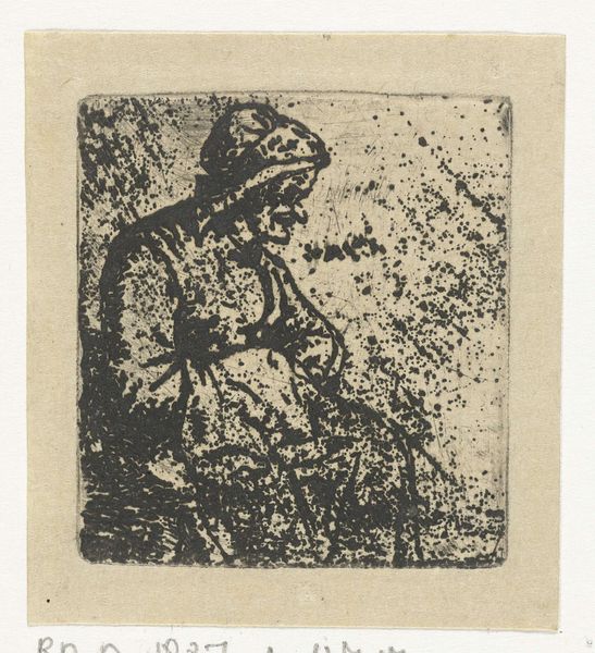 Elchanon Verveer created this etching, "Standing Fisherman with Pipe," in the 19th century. The composition is strikingly simple: a lone figure dominates the frame, yet it's the texture that immediately captures your attention. Verveer masterfully uses the etching technique to create a dense network of lines, a semiotic system of signs that invites interpretation. The rough texture of the fisherman's clothing and the surrounding foliage contrasts sharply with the smoother lines suggesting smoke and water. This contrast not only adds depth to the image but also complicates our reading of it. Consider how this challenges traditional notions of representation. Is Verveer merely depicting a fisherman, or is he engaging with broader questions about the relationship between man and nature? This artwork functions on multiple levels, inviting us to question the very nature of seeing and knowing.