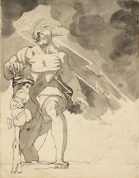 Curator: It's almost monochromatic; the stark shades give it such drama. Editor: Indeed. What strikes me about "Male Traveler in a Storm," a drawing attributed to William Hamilton around 1770 to 1780, is how economically it captures the Romantic spirit. You have a solitary figure, battling nature itself. Curator: He looks properly windswept, doesn’t he? That determined angle of his head, shading his eyes. You can almost feel the rain on your face just looking at it! There’s such a vulnerability there too – like he’s facing something massive and unforgiving. I get the romanticism of it, totally. Editor: Precisely! Notice how Hamilton employs a simple palette, relying on the tonality and dynamism of pencil lines. The contrast between light and shadow—chiaroscuro, if you will—heightens the emotional intensity. The very swiftness of the marks, barely there on the traveler’s face or limbs and darker around the threatening background, it speaks to both a physical and psychological turmoil. Curator: Right, like a raw emotion spilling onto the page! Do you think he drew this from life? I mean, being out in a storm like that... you would be shivering just thinking about sketching under those conditions. Editor: Unlikely, though that’s a valid question. Most likely, this kind of scene came from literary paintings that were being created at that time. Consider, too, the artist was British, in an era when wealthy Brits would make the ‘Grand Tour’ around Europe, taking in ruins and scenes such as this… though this drawing, I think, also owes a debt to History Paintings with its rather formal rendering of the human figure, though even more romantic, still. The man looks like he is at the ready! Curator: It’s strange and great because you can just see him as a vulnerable, solitary wanderer, just as much as you can picture some kind of heroic ideal too! Hamilton's managed to catch a fascinating moment here. It really lets your imagination run wild. Editor: Well, considering this as part of a series of studies makes a good bit of sense, as Hamilton does an anatomical study of a foot on the reverse of this sheet. The sublime and the minute! I will always value Hamilton’s close and deeply considered work, especially its reflection of a time caught between social unrest and Romanticist ideas.
