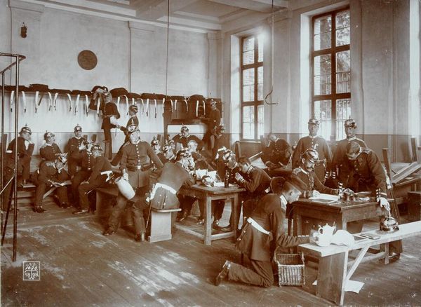 Editor: This photograph by Waldemar Titzenthaler, titled "War: Germany. Berlin. Prussian Guard Regiment: Life in a Regiment of the Prussian Guard: In the Guard House," shows two scenes of soldiers in what appears to be their barracks. It’s interesting to see them both at attention and seemingly at rest. What can we say about the context of this image? Curator: Consider the socio-political climate of pre-war Germany. The Prussian Guard represented the elite military power, heavily romanticized and crucial to national identity. Images like these served a powerful propaganda role, both internally and externally. How do you think the photographer wanted the public to view the military? Editor: Perhaps, he wanted to showcase both the rigor and the downtime, a complete picture of their service? Curator: Exactly. This duality served to humanize the soldiers while reinforcing the discipline and order that were the bedrock of Prussian military power. A very calculated image, wouldn't you say? Editor: Absolutely. I hadn't thought about the propaganda aspect so directly, but it makes perfect sense!