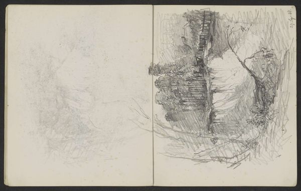 Curator: Here we have "Studie" a pencil drawing by Anton Mauve, likely created between 1848 and 1888. It's currently housed here at the Rijksmuseum. Editor: My first impression is one of profound quietude, despite the rather agitated, almost frantic mark-making. Curator: It’s fascinating how Mauve uses the starkness of pencil on paper to evoke such a vivid sense of place. The tonal gradations create depth and suggest atmosphere despite the work’s minimalist approach. I wonder about his process—how the linear strokes coalesce to depict, what I presume, a serene Dutch landscape. Editor: Absolutely, but to call this "minimalist" might erase a larger colonial history of Dutch landscape art from this era. Who inhabited, labored and perhaps was erased from this supposedly 'serene' vista? What are the socio-political implications of this apparent untouched wilderness in the Netherlands when the work was made? Curator: A provocative point. Though, formally, one might consider the interplay of light and shadow as paramount. See how Mauve contrasts the density of the foliage with the open space. His use of hatching creates variations of texture and intensity which, to me, are compelling compositional elements. Editor: True, his technique demonstrates a clear artistic understanding. But can we truly divorce art from its historical situation? Did Mauve, through similar idealized landscapes, possibly contribute to an artistic framework that overshadowed the exploitation of rural populations and their environments? A close reading must acknowledge these broader cultural dynamics at play. Curator: It is a valuable interpretation. But it's crucial not to exclusively frame artworks solely within oppressive dynamics. The inherent beauty and artistry on view should be recognized as an entry point toward further dialogues around societal questions, if that makes sense. The careful attention Mauve gave the landscape, his acute perception of light and shadow, that to me is testament of a sensitive, perhaps enlightened, soul. Editor: Fair enough; but our job as responsible observers should also require that this perception co-exist with the broader framework, right? That way, it may enhance rather than curtail true engagement with works of art. Curator: Indeed! Art appreciation involves understanding, not disregarding, contextual elements in a never-ending process of questioning. Thank you! Editor: Likewise! It is important to remember how interconnected all art forms can be, and how it continues to represent power.