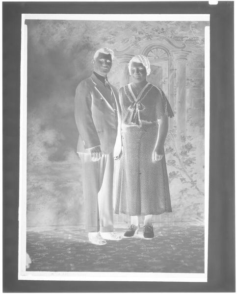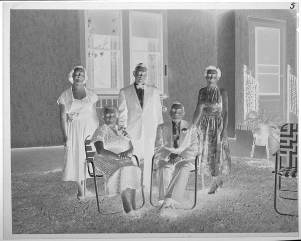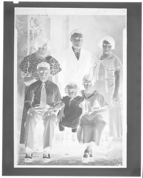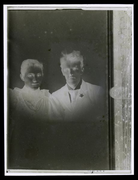 Curator: This intriguing photograph, taken by John Deusing, is currently titled "Untitled (two couples in formal wear, studio portrait)." Editor: It has the feel of an inverted memory, like a dream fading into stark light. Curator: Precisely! The photograph's reversal really alters our perception. Notice the recurring symbolism of pairs, perhaps signifying kinship and partnership. Editor: Those floral bouquets held by the women—almost shields—are fascinating. Do you think they speak to a specific ritual, or perhaps a secret language? Curator: It's hard to say for sure, but flowers often act as markers of important events, as emblems of beauty but also of ephemerality. Editor: It’s funny how this ghostly image seems to be both incredibly present and profoundly absent at the same time. Curator: Indeed, and that very tension is what makes it so compelling.