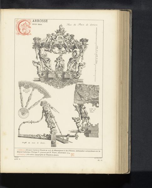 Curator: This is a reproduction of a design for a triumphal chariot created by Peter Paul Rubens to honor Ferdinand of Austria. The print, appearing in an aged book, showcases the intricate detailing of the chariot design. Editor: Immediately, I'm struck by the density of the image. It’s incredibly detailed, isn’t it? The lines are fine, yet there's such a strong sense of baroque opulence and movement despite being static. Curator: Indeed. Rubens designed the chariot as part of celebrations around Ferdinand’s entry into Antwerp, so understanding the political climate is key. It embodies Habsburg power and legitimizes colonial exploitation, with subtle figures rendered almost incidental. Editor: From a formal perspective, note how the verticality is exaggerated by the flags and figures, directing our gaze upwards, enhancing that feeling of grandeur and celebration. And that intense shading giving volume and solidity to the figures despite the print’s flatness. Curator: Precisely, the placement of Habsburg symbols sends an unmistakable message of dominance during that time. Think about the indigenous populations impacted, as a single figure, trapped beneath that juggernaut. How does the chariot serve to broadcast Habsburg propaganda? Editor: Yet there is a certain elegance achieved with only linear precision. How those spiraling details achieve so much dynamic movement even in stillness is technically amazing. Each character, drape and pennant seems ready to come alive. Curator: Baroque art and absolutist authority often go hand in hand, presenting rulers and their empires in idealized, even bombastic terms. Consider the lasting impact, seeing those ideals today even? Editor: The careful deployment of contrast leads our eyes expertly through this composition to key areas and important iconographic motifs. A masterclass really on how to visually orchestrate a narrative of this magnitude using simply the line. Curator: Reflecting on the history allows for considering how this relates to cultural hegemony of today and questions the visual vocabularies still at work legitimizing power and authority now. Editor: Looking purely at line, light and the structured harmony created through formal organization makes it beautiful even while divorced of any contextual information, in and of itself.