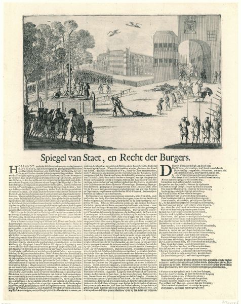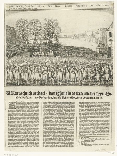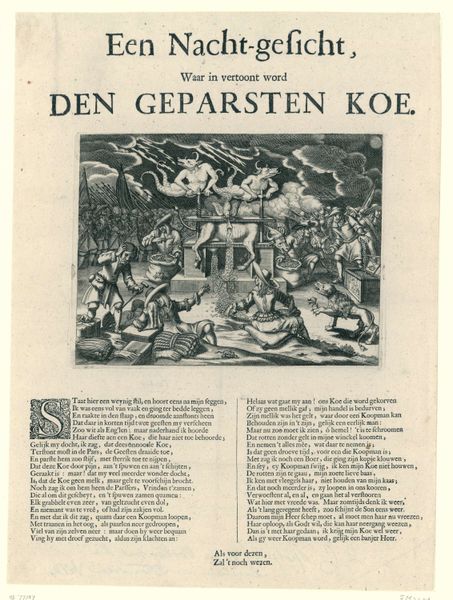 Editor: This print, "The Verminking of the Bodies of the Brothers de Witt, 1672", currently residing at the Rijksmuseum, is attributed to an anonymous artist. I'm immediately struck by its grim nature. The figures around the central scene look quite disturbed. What do you see in this piece from a more formal perspective? Curator: Indeed. Formally, the print achieves its unsettling effect through stark contrasts. The artist employs strong diagonals to emphasize the violence enacted on the bodies, which are disturbingly suspended. Consider the use of line here: the crisp, almost clinical rendering of the figures clashes violently with the emotional weight of the scene. Note also how the engraver contrasts the relative clarity of the central drama with the text obscuring and framing the image. Editor: So, the composition itself enhances the horror of the event depicted? Curator: Precisely. Furthermore, examine the symbolism at play through the composition. The brothers are positioned almost as specimens on display; this speaks to an intentional dehumanization. Ask yourself: how do these visual devices work together to provoke a reaction? Is the effect to ennoble the figures through religious imagery, or condemn the event? Editor: It’s interesting to think about how the formal elements—the lines, the composition—create a narrative that challenges a simple, straightforward reading of the event. Are you suggesting the artist might be making a comment through this technical manipulation? Curator: That's the crux of the question, isn't it? Through careful observation of the form, we might uncover nuances obscured by the historical context. How might the artist’s choices serve as a subtle indictment of the mob? Editor: I see what you mean! I had focused so much on the historical event that I hadn’t considered how the artist used the tools of engraving to create such a charged and ambivalent image. Thank you. Curator: The devil, as they say, is always in the details. And, in art history, meaning often arises from careful attention to form.