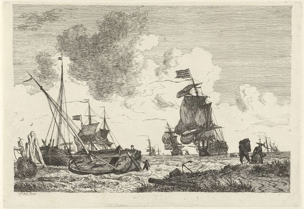 Editor: Right, let's talk about "Ships at Anchor in a Bay," created by Reinier Nooms around 1651. It's an etching, so the detail is incredible. It has a serene quality to it, even though there's this latent sense of maritime power and mercantilism lurking beneath the surface, don’t you think? What is your perspective on the composition and intent? Curator: Oh, absolutely! Serene, yet with the ghost of ambition floating just below the waves. It reminds me of a quiet play on a world stage. Nooms, nicknamed Zeeman, truly knew ships, not just how they looked, but how they moved, almost how they breathed. He captures that hushed expectancy of vessels held at bay – gathering, perhaps, before setting off on grand ventures or long voyages home. See how he uses those delicate lines to define form, atmosphere, and movement! The light seems to dance on the water, giving the ships this ethereal glow. And I wonder... is this tranquility genuine, or a kind of poised deception? Editor: Deception? That’s a thought I hadn’t considered. What makes you say that? Curator: Well, remember the Dutch Golden Age wasn't all windmills and tulips. The sea represented freedom and prosperity but also conflict and competition. The ships, majestic as they seem, were instruments of trade, exploration, and, yes, often war. Think of this print as a portrait. It reflects outward opulence concealing shrewd mercantile tactics. It leaves me wondering if there is some kind of agreement occurring or deal being struck amongst those on shore. Editor: Ah, a gilded cage then, maybe? I am definitely more conscious of the image now! Curator: Precisely! Nooms gives us a glimpse of a society balancing its ambition on a knife's edge, poised between peace and potential turmoil, between fortune and the tempestuous mood of the ocean.
