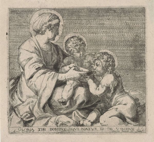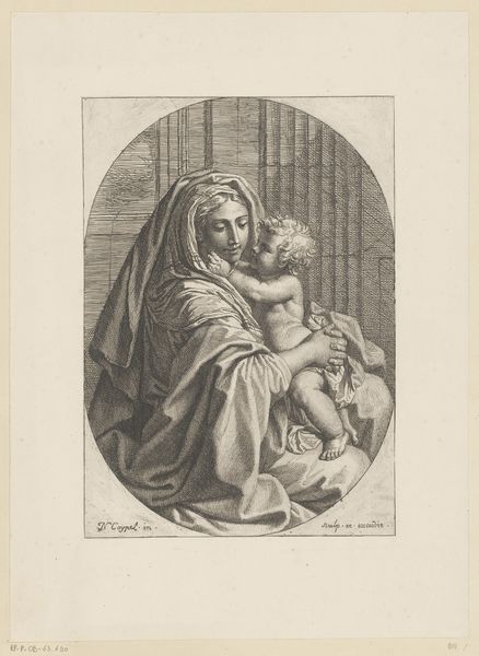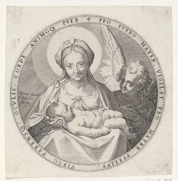 Curator: This print, entitled "Maria met Christuskind op de schoot", which translates to "Mary with Child Christ on her lap," was created sometime between 1615 and 1670. Its author? Jérôme David. It resides here at the Rijksmuseum, a remarkable piece rendered in engraving. Editor: There's something profoundly intimate about it. The Virgin Mary seems so tender, almost weary, as she cradles the child. It reminds me of countless images of motherhood I’ve seen in chapels around the world, though with its own stark beauty. Curator: Indeed. David captures a universal sentiment. Being an engraving, the piece really foregrounds process, the intense work of making an image—note the delicate hatching, almost relentless in its detailing. Engraving, to me, speaks of patience, skill, and repetition. Editor: You can practically feel the artist's hand moving, can't you? The physical act is really evident. All that dedication of working with a plate and acids. It also emphasizes this religious imagery as labor – devotional labor in itself. Beyond that, what stands out to me is how he frames Mary and child. See how David positions them within a circle that holds a prayer. It feels like looking through a window onto a very personal moment. Curator: It is quite personal and it does echo similar artworks within the baroque style and from the Northern Renaissance. The image and its inscription, though, it feels almost trapped and idealized simultaneously. It speaks of this tension between humanity and divinity—the earthiness of the subjects, in counterpoint to their saintly roles. Editor: And let’s not forget that the piece exists as a print, it suggests ideas about accessibility and consumption within the religious framework. Here is the possibility that common people had some level of connection with sacred imagery through reproductive technology. Curator: It also invites speculation about who this Jérôme David actually was. Is the artist of such work connected to the printing and making or is he one far from the final production and its materials? Editor: A wonderful mystery to unravel… each detail etched into the plate offering further food for thought, doesn't it? I'm so impressed by this image. Curator: Me too. These simple depictions resonate far beyond their time, I guess.