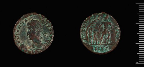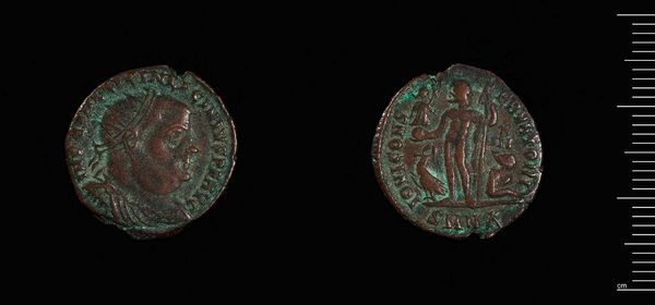Curator: This is an interesting artifact: an Anonymous Commemorative Issue from Alexandria depicting Constantine I. It weighs only 2.59 grams. Editor: It's so small, but immediately striking. I see a figure in profile, seemingly a ruler wearing a helmet, but it feels worn, doesn't it? Curator: The wear speaks to its function and material reality. It was handled, traded, circulated—a tool of economic and political power, a propaganda piece almost. Editor: Precisely. And flipping it over, we see Romulus and Remus suckling from the she-wolf, a potent symbol loaded with ideas of origins and legitimacy, not just for Rome, but also for Constantine. Curator: The coin itself, its production and distribution, served as a constant reminder of Constantine’s authority. Editor: Absolutely, it's about the narratives that it embodies and perpetuates. Thank you for illuminating the context and craft behind such a tiny, but weighty object. Curator: My pleasure. It's a great reminder to consider the hands and machines that make such things.