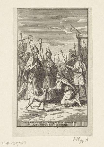 Curator: Standing before us is "Dirk VI begs the Bishop of Utrecht for forgiveness, 1146," an engraving crafted by Reinier Vinkeles in 1789, now residing here at the Rijksmuseum. Editor: It strikes me as quite theatrical, this depiction. The almost operatic gestures, the sky looming overhead... There's a real sense of weighted drama, wouldn't you agree? Curator: Indeed. It’s neoclassical in style but definitely evokes Baroque sensibilities in its sense of drama and grandeur. This piece really demonstrates the public role of art in visualizing and cementing historical narratives, doesn't it? Consider how it depicts power dynamics. Editor: Precisely! And what's fascinating is unpacking those dynamics. We see Dirk VI, the Count, humbled before the Bishop, a clear display of ecclesiastical power over secular authority, which in our contemporary lens demands exploration. How does the print reinforce these power structures, and whom does it serve to represent favorably? Curator: I think it’s equally important to view this work within the context of its own time, the late 18th century. The appeal to historical events also acted as a potent way of engaging with contemporary political issues. The engraving becomes a stage upon which to reflect on Dutch identity. Editor: And further examine this intersection of identity! Whose stories get amplified through history paintings like this? Where are the women in this narrative? It really invites a deeper questioning of how these historical accounts are constructed and whose voices might be missing or suppressed in this rendition. Curator: A valid point, indeed. Its creation itself also invites questioning – what led to it and how its dissemination impacted its perception. It reminds us to consider not just what’s represented, but how and why. Editor: Yes, this visual piece is much more than simply what’s immediately evident. A deeper engagement provides us the capacity to challenge perceived notions of history. Curator: Indeed. And from there, we are able to consider our present circumstances with hopefully a greater, wiser eye.